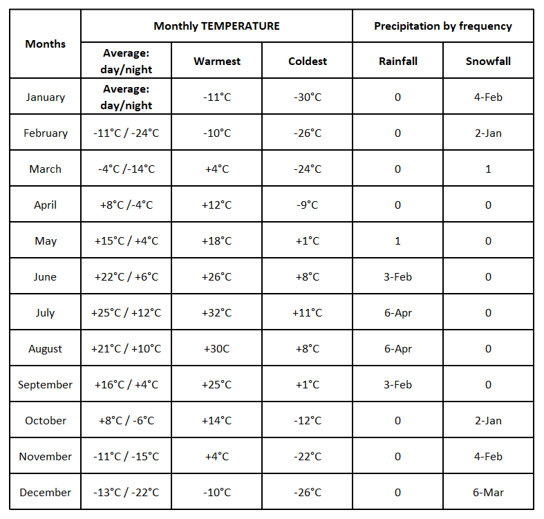 Mongolia experiences a strongly continental climate, marked by four distinct temperature fluctuations, low precipitation, and notable regional variations based on latitude and altitude. Average temperatures range from approximately -4°C to -8°C in mountainous areas, rising to around 2°C in the steppe desert region and approximately 6°C in the southern desert bordering China. The temperature fluctuates significantly throughout the year, with maximums reaching around 24°C in July, while January sees minimum temperatures dropping to about -28°C.